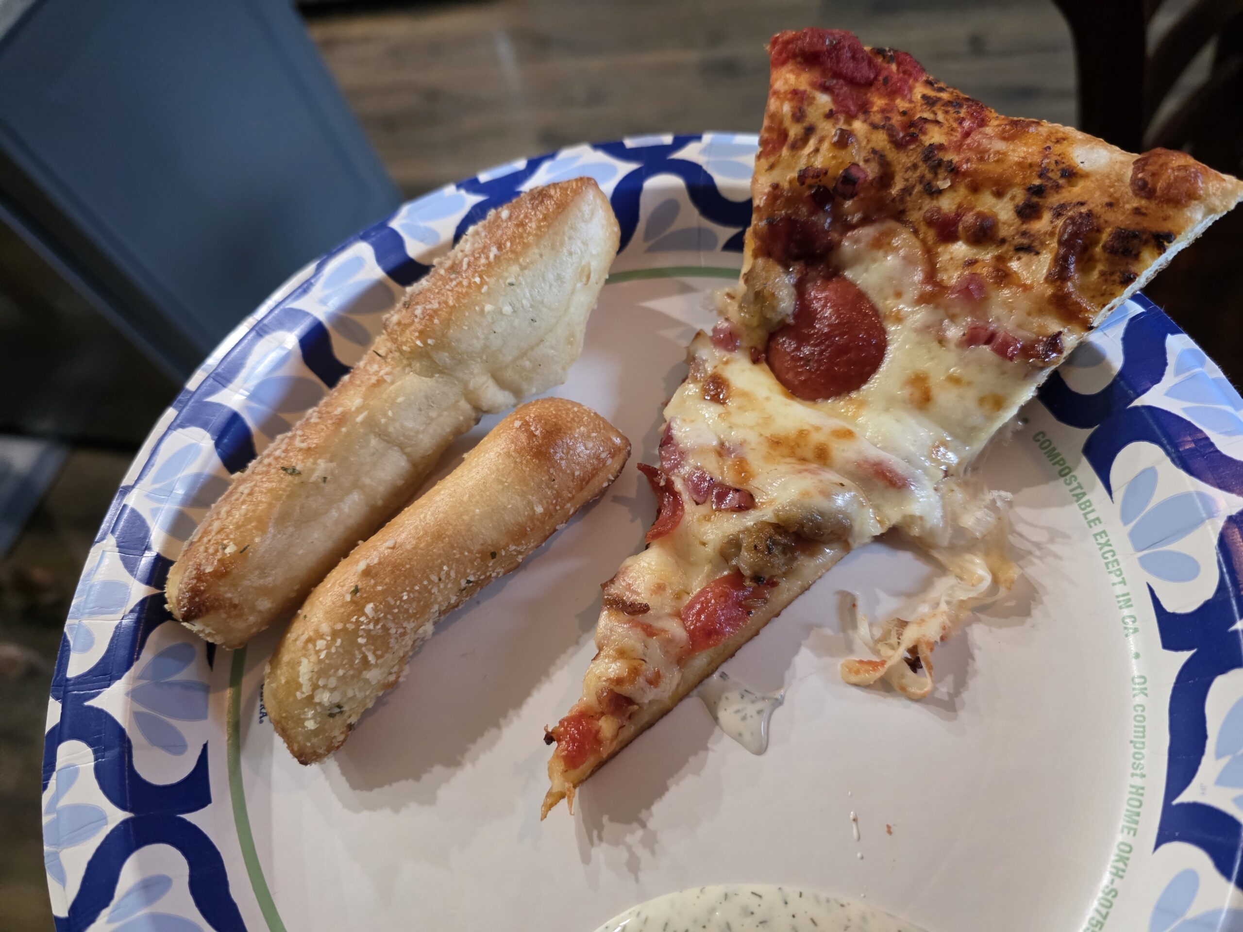 The moment I cracked open that little plastic ramekin, I knew exactly what was about to happen: dill slapped. And sure enough, the ranch tastes just like it looks, straight-up dill dip. Now, don’t get me wrong, I’m not mad at dill dip. It was actually pretty tasty! But when I order ranch, I want ranch. Dill dip has its own rightful place in the universe, like hanging out with carrot sticks or keeping celery company, not being the third wheel on my pizza date. For ranch purposes, this one falls into the It’ll Do category, but give it a shot with your veggie sticks! The pizza was pretty tasty, too.