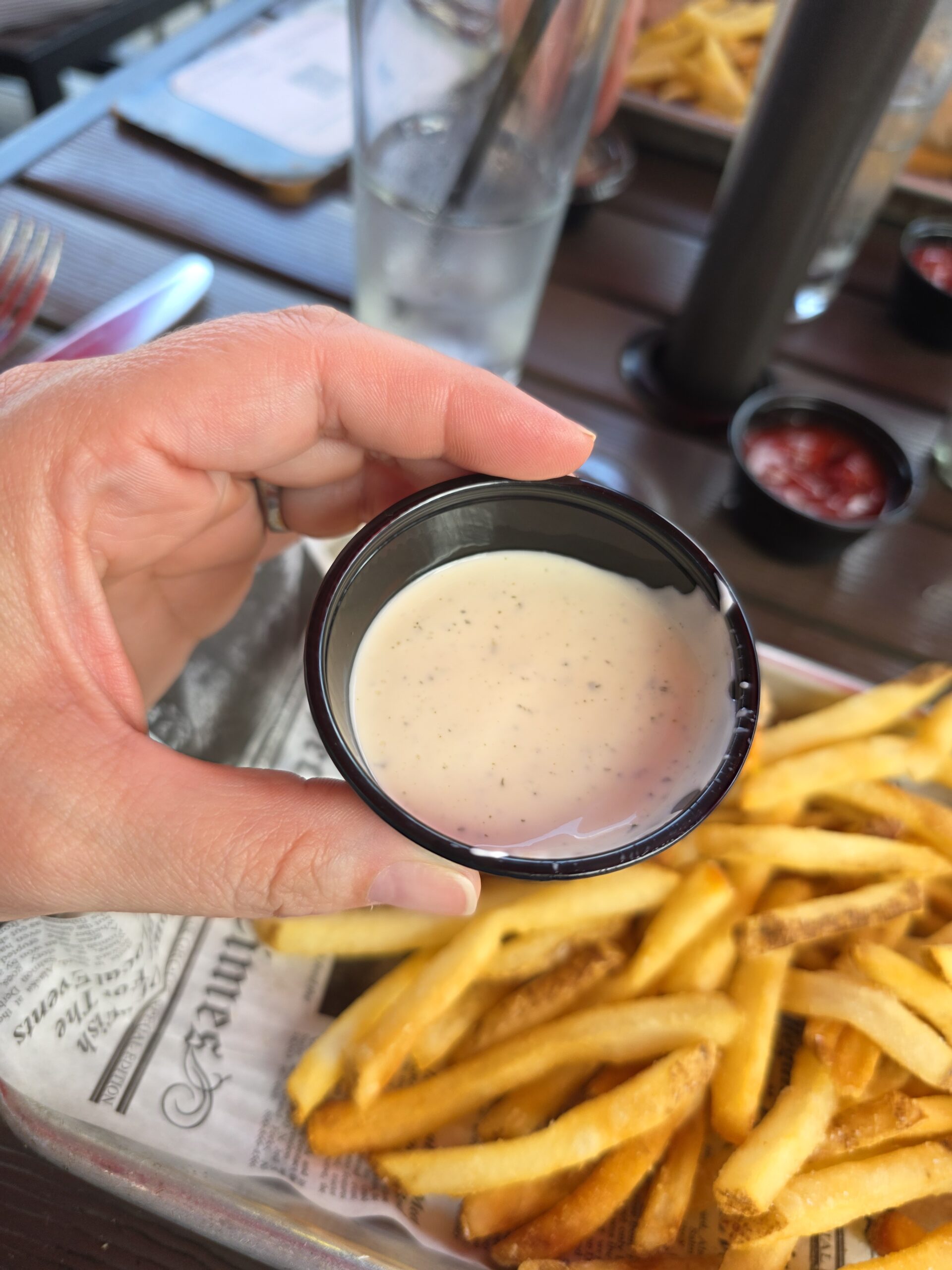 Park Place Gastro Pub serves up a ranch that is there for the people: smells good, good consistency (on the thicker end), and has that salty kick without going overboard. Flavor-wise, itโs solid. Not a life-changing moment, but definitely a ranch worth ordering.